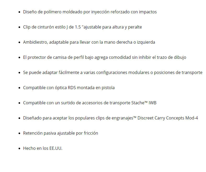 Disponible en configuraciones Base y Premium. Stache ™ IWB es el sistema de funda de transporte oculto modular Inside-The-Waistband más avanzado tecnológicamente diseñado para nunca ser visto. El modelo base incluye funda y clip para el cinturón. El modelo Premium también incluye soporte de cargador y garra oculta.