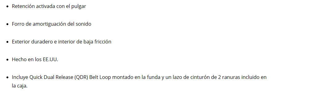 Con su retención optimizada activada por el pulgar, la Serie T mantiene su arma de fuego lista mientras mantiene una seguridad total. Gracias a un movimiento de dibujo que funciona con el principio Master Grip, podrás entrar en la pelea incluso en las circunstancias más estresantes. Una combinación de polímero exterior reforzado y forro hidrófobo liso y amortiguador del sonido garantiza que su Serie T funcione sin importar los elementos y la situación. Con el L2C se incluye el bucle de correa de doble liberación rápida (conectado) y el bucle de cinturón de 2 ranuras.